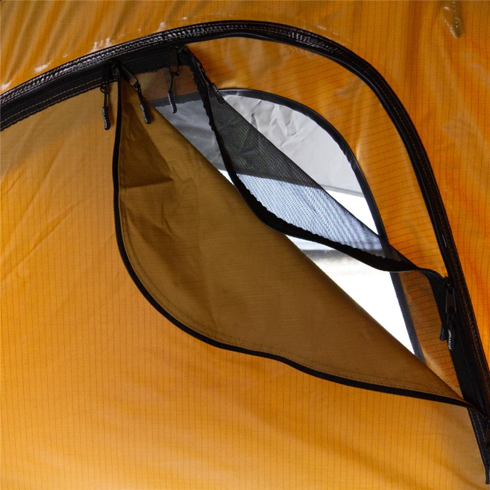 Šotor je izdelan iz trpežne tkanine RIP-STOP s 280 g/m² in vodoodpornostjo 2000 mm, kar pomeni, da brez težav prenese tudi večurne močne padavine. Material je odporen na plesni, mehanske poškodbe in zagotavlja optimalno kroženje zraka.