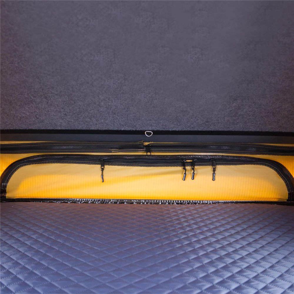 Notranjost zgornjega pokrova je obložena z avtomobilskim filcem, na katerega je mogoče pritrditi različne dodatke, kot so torbe, organizatorji, svetilke ali powerbanki.