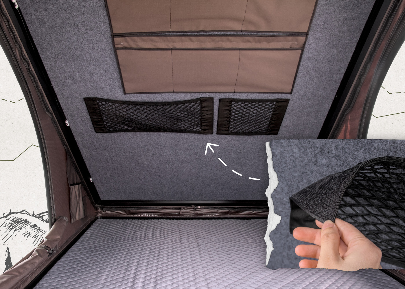 Notranjost zgornjega pokrova je obložena z avtomobilskim filcem, na katerega je mogoče pritrditi različne dodatke, kot so torbe, organizatorji, svetilke ali powerbanki.